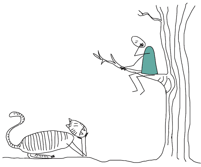 Pasan las horas. El hombre mira hacia abajo, el tigre hacia arriba, sabiendo que tarde o temprano, el hombre tendrá que bajar.