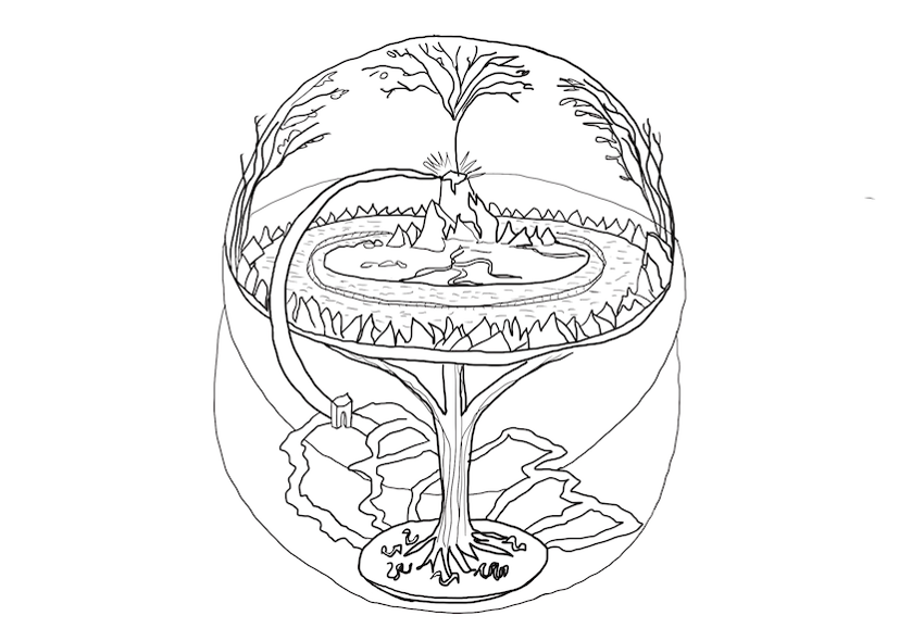 A menudo se marca como el axis mundi, el lugar donde se juntan las tres regiones del cosmos: Cielo, Tierra y Submundo.